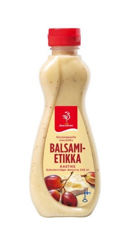 La salsa finlandese è composta da aceto di vino bianco con l'aggiunta di olio di colza, fecola di patate, spezie e aromi. Si serve a tutto pasto, dalle zuppe alla frutta e al gelato. Non sarà possibile spremere un getto sottile a causa del foro troppo grande nel tappo dell'erogatore. Conservabile per due anni dalla data di produzione.