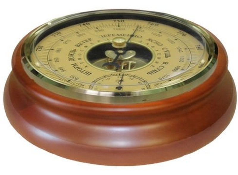 Questo barografo bimetallico privo di liquidi mostra non solo il valore della pressione atmosferica, ma anche la temperatura ambiente. La cassa stessa è realizzata in legno naturale, c'è un quadrante ampio e comodo con numeri grandi che sono facili da leggere anche a lunga distanza. Tutti gli elementi metallici sono realizzati in ottone e hanno un rivestimento anticorrosione, quindi un po' di umidità non può danneggiarli. Il costo consigliato per le catene di vendita al dettaglio è di 2900 rubli.