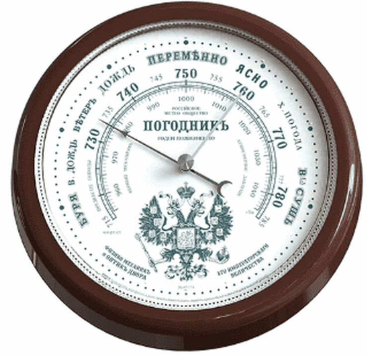 Un barometro economico e in stile antico nel suo design, che non solo mostra la pressione atmosferica, ma è anche in grado di emettere previsioni meteorologiche generali: una giornata nuvolosa o soleggiata in anticipo, nonché la probabilità di precipitazioni o tempeste. La cassa del dispositivo è realizzata in acrilico lucido, il vetro protettivo del quadrante è decorato con strass. È caratterizzato dalla massima precisione per il suo segmento. Il costo consigliato per le catene di vendita al dettaglio è di 1970 rubli.