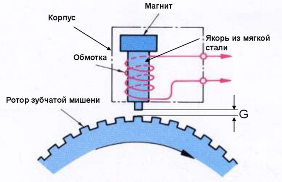 Durante il parcheggio, un campo magnetico costante agisce attorno alla bobina e non c'è corrente elettrica al suo interno. Quando la ruota inizia a muoversi, i denti del disco di trascinamento passano accanto all'elemento sensibile e si crea un campo magnetico alternato. A causa dell'effetto dell'induzione elettromagnetica, nella bobina appare una corrente elettrica alternata, che viene utilizzata per misurare il numero di giri (velocità, frequenza).