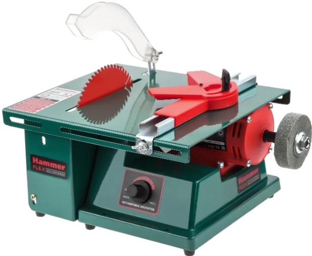 Il meccanismo con un disco da taglio con un diametro di 216 mm funziona perfettamente, crea un taglio netto, aspira piccoli trucioli nell'uscita della polvere, che è facile da pulire. Il corpo compatto è realizzato in plastica spessa e resistente. La superficie di lavoro 500*658 mm non ha estensione aggiuntiva.