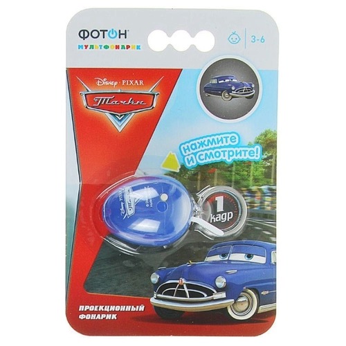 Il proiettore portachiavi mostra un'immagine: il personaggio dei cartoni animati "Cars", Doc Hudson. L'immagine è colorata e di qualità sufficientemente elevata. Puoi proiettare su qualsiasi oggetto, a una distanza accessibile di 30-400 centimetri.
