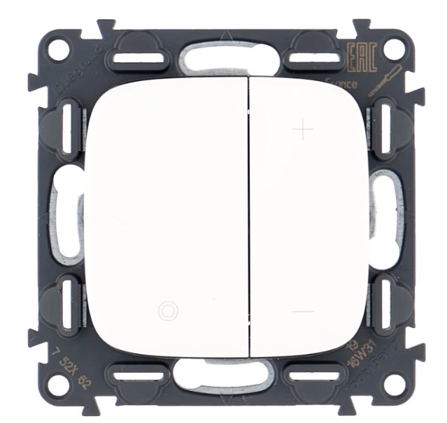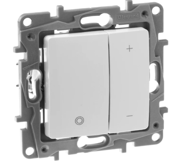 Con questo prodotto, puoi accendere e spegnere la luce nella stanza, oltre a regolare la luminosità dell'illuminazione. È adatto per lampade con una potenza totale fino a 400 watt. Il meccanismo Legrand Etika 672218 è composto da due pulsanti. Il pulsante sinistro è progettato per accendere e spegnere l'illuminazione e il secondo per regolare il livello di illuminazione nella stanza. Sotto i tasti del dispositivo è presente un LED che si illumina di rosso in modalità di funzionamento capacitiva, e di verde in modalità induttiva. Una di queste modalità può essere forzata. Anche in questo modello è possibile impostare la memoria automatica che, una volta accesa, emetterà la luminosità utilizzata prima.Questa funzione può essere disabilitata se necessario.