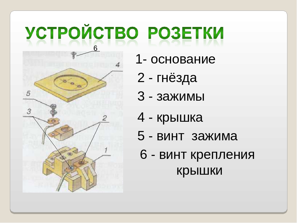 Viti speciali sono utilizzate per fissare il nucleo elettrico nelle prese. Si attorcigliano in una piastra che preme il contatto. Quando, nel tempo, il contatto si allenta, la vite può essere serrata delicatamente.
