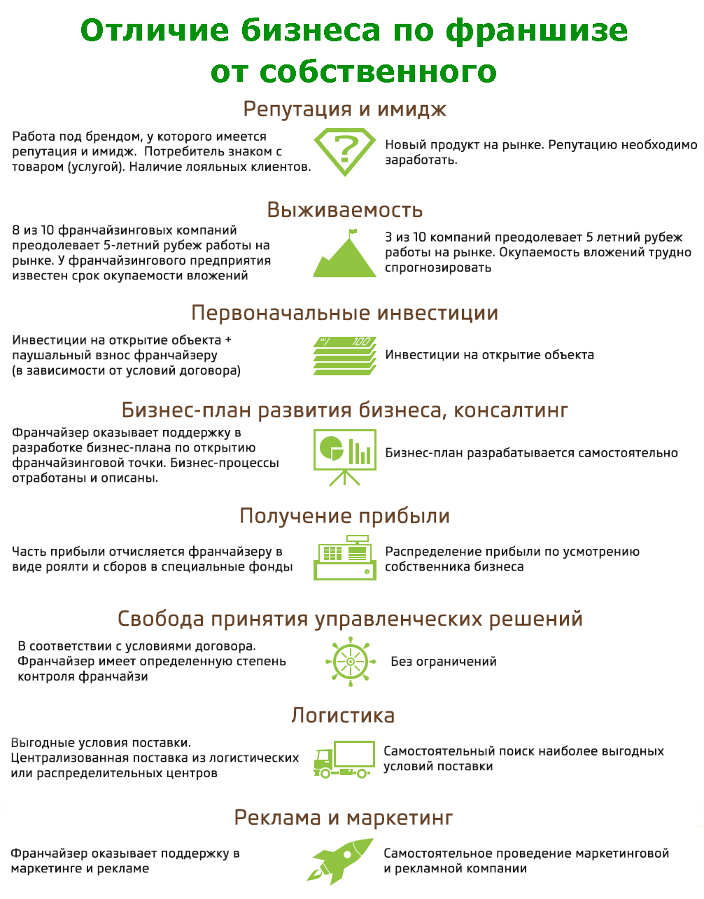 Tutti questi (e altri) problemi possono essere risolti acquistando un franchising. E se consideri che la maggior parte dei brand ha abbandonato contributi forfettari e royalties, puoi anche ridurre i già non piccoli costi di avvio di un'impresa. Bene, naturalmente, anche la riduzione del rischio è un vantaggio.