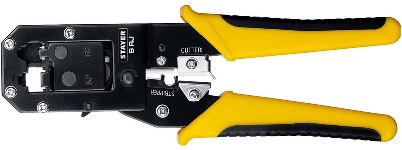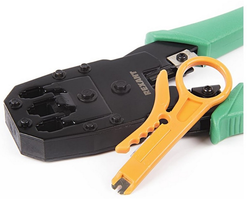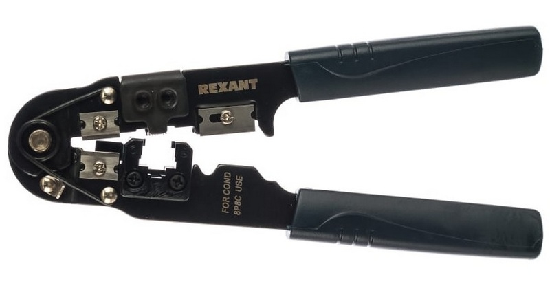 Un'altra opzione per una pinza semiprofessionale che può funzionare con un'ampia gamma di cavi di rete.L'utensile è realizzato in acciaio per utensili temprato, brunito nella sua composizione. Il dispositivo viene fornito con uno strumento per spellare (spellare) il cavo. Le maniglie sono rivestite nella custodia di plastica e hanno una copertura antiscivolo. Il paese di origine è la Cina, il costo consigliato per i negozi è di 790 rubli.