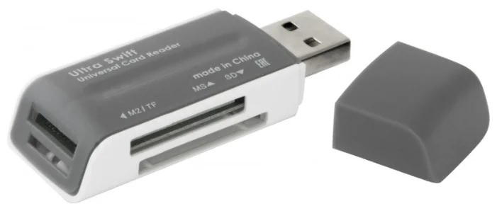 Un semplice lettore di carte economico si adatta perfettamente alla sua funzione principale. Ci sono quattro input per i media popolari.Supporta la maggior parte dei formati di schede di memoria: MC, SD, SDHC, SDXC, microSD, microSDHC, microSDXC. Si collega a un computer o tablet tramite USB 2.0. Secondo le recensioni dei clienti, è comodo da usare, non richiede driver speciali. In termini di dimensioni: non più di un'unità flash con cappuccio rimovibile, che si perde facilmente. Sei mesi di garanzia.