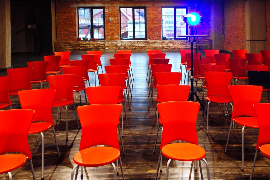 Nella scelta, va tenuto presente che i posti vuoti in una sala troppo spaziosa provocheranno una sensazione di insicurezza tra i relatori. Inoltre, gli organizzatori dovranno pagare più del dovuto per l'affitto. Anche una stanza troppo piccola non è la scelta migliore. Il clamore con la ricerca di sedie aggiuntive, l'aria viziata nella stanza "lubrifica" le impressioni positive anche da materiale utile e ben presentato dal docente.