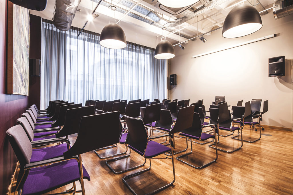 Il sistema di amplificazione del suono a soffitto offre comfort sia per gli ascoltatori che per gli oratori. Comodi trasformatori di sedie pieghevoli consentono di organizzare lo spazio secondo i desideri degli organizzatori.