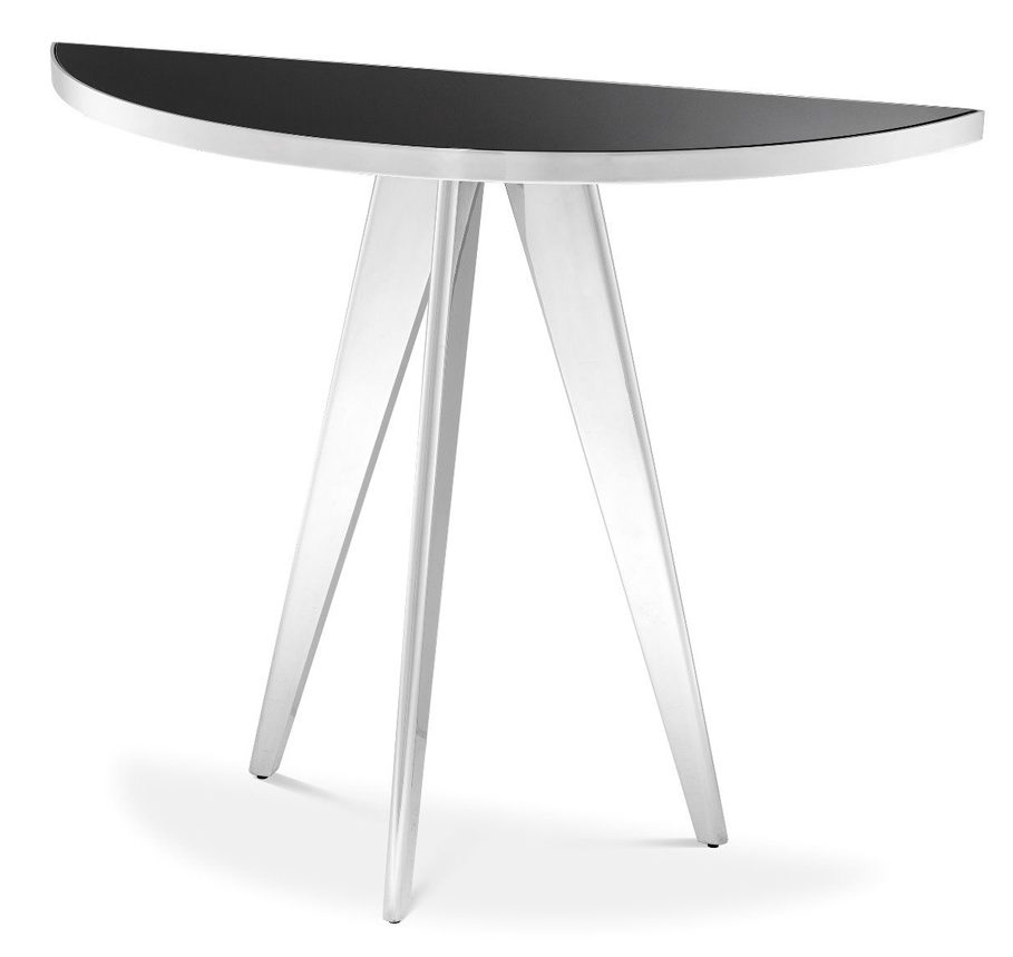 Per una piccola camera da letto, la consolle Aston 114828 Eichholtz in acciaio inox lucido è l'ideale. Il modello ha una taglia piccola e una forma interessante.Il prodotto è installato vicino al muro o al letto. Un ripiano del tavolo a forma di mezzaluna può sostituire una toletta o può essere utilizzato per riporre piccoli oggetti.