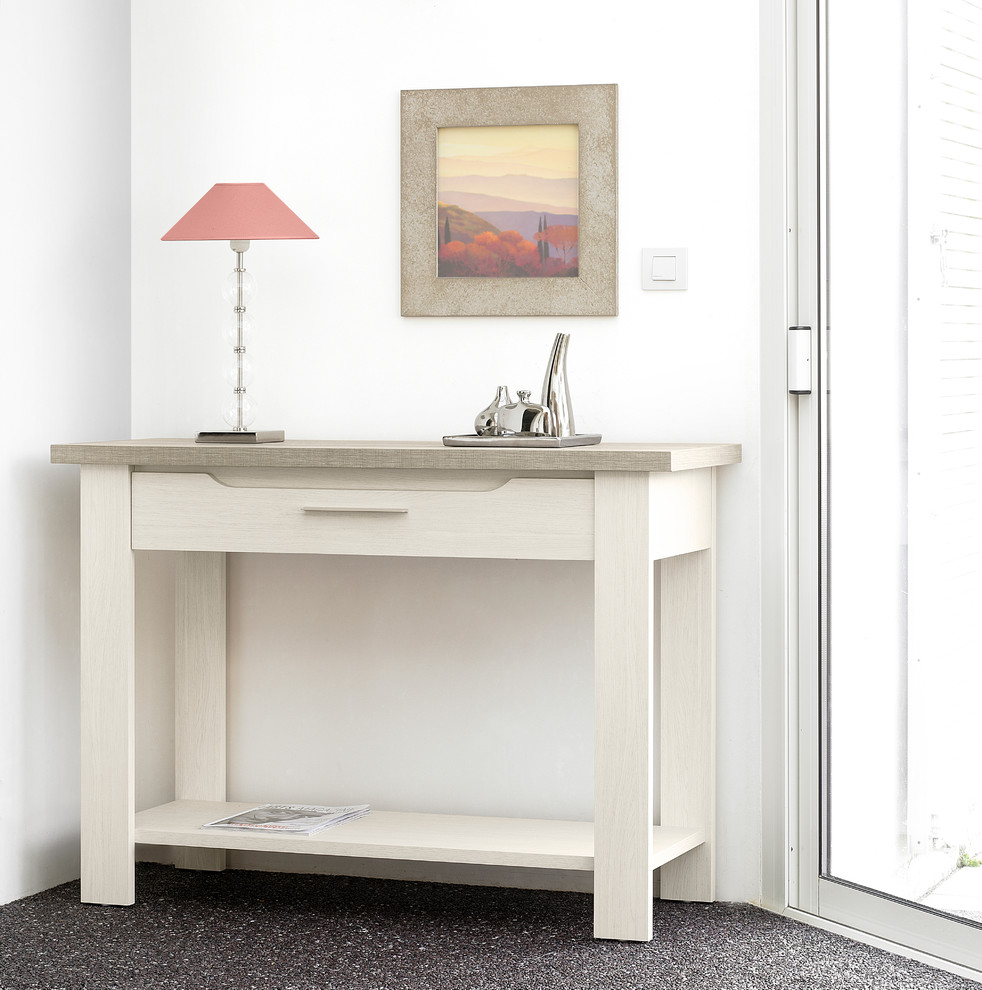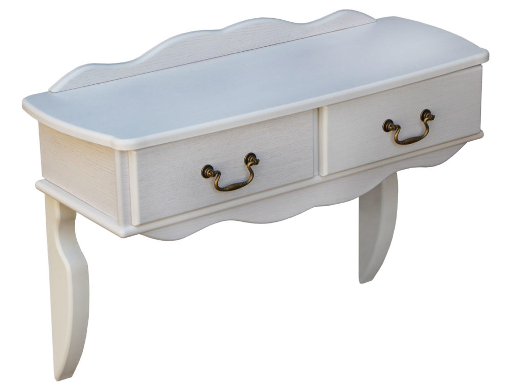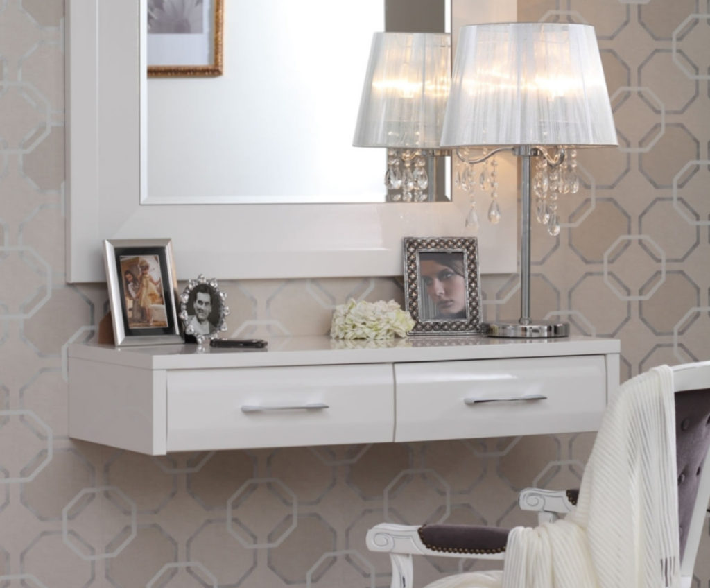 Il modello da parete sarà l'aggiunta perfetta a qualsiasi camera da letto. L'altezza del prodotto è di soli 21 cm Il tavolo è fissato al muro e può essere utilizzato come aggiunta allo specchio. Sono previsti 2 cassettini per riporre piccoli oggetti.