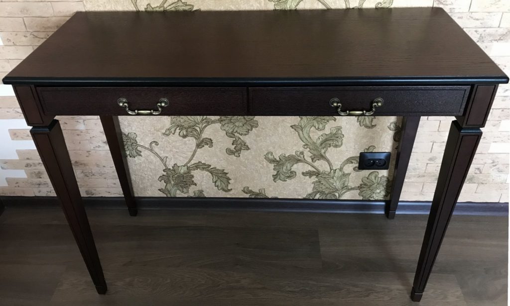 Il design classico rende il tavolo popolare tra i clienti. Mobili adatti per arredare una camera da letto o un corridoio. Il prodotto è realizzato in faggio, quindi sembra costoso ed elegante. La struttura in legno è dotata di 2 comodi cassetti per piccoli oggetti.