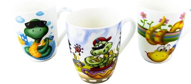 Composto da quattro tazze. Lo sfondo principale è bianco, immagini di serpenti dei cartoni animati.