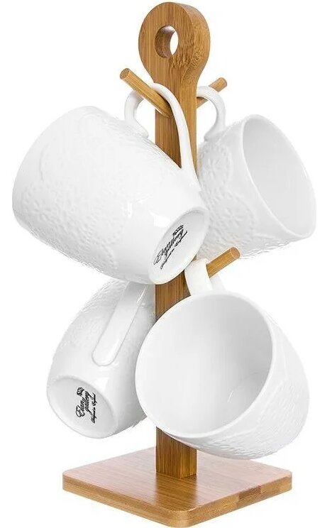 Composto da quattro tazze (350 ml ciascuna), supporto in legno. I vasi alti sono decorati con un motivo a rilievo di pizzo lungo il diametro esterno. C'è un'elegante maniglia sottile. Supporto - bambù, verticale.