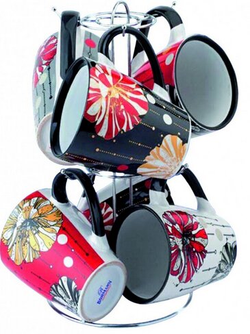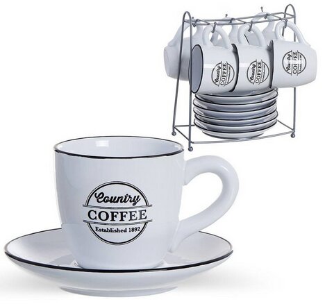 Set completo: 6 tazze, 6 piatti, supporto cromato (13 pezzi).