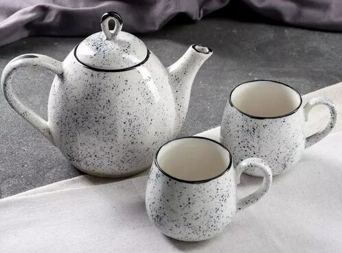 Tazza a forma di botte. Lo sfondo principale è chiaro, punti irregolari e il bordo del collo è scuro. La teiera ha un bordo scuro del collo dell'apertura principale, beccuccio. Il coperchio della teiera si apre con un anello.