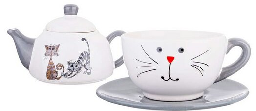 Composto da tre pezzi: tazza, teiera, piatto. Colorazione - colore bianco, grigio. Immagini: teiera - 2 gatti, boccale - muso di gatto.