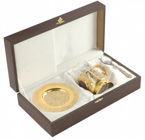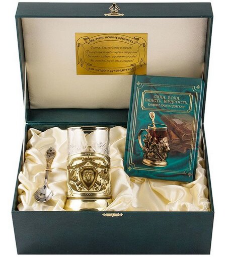 Contiene bicchiere di cristallo, sottobicchiere in ottone, cucchiaio (acciaio inossidabile). Il libro degli aforismi “Forza. Volere. Potenza. Saggezza. Codice del Leader.