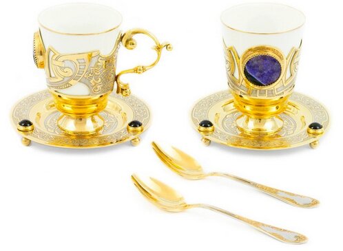 Il set comprende: due tazze, cucchiai, piatti. I lati di piattini e tazze sono decorati con agata. Materiali: porcellana, ottone, nichel, doratura (campione 999.9).