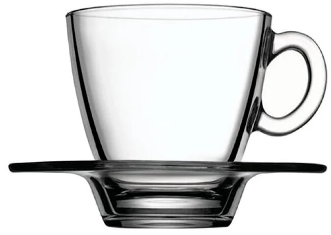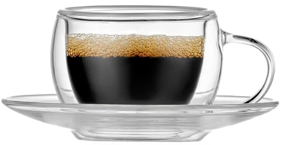 Progettato per 2 persone, ci sono 4 articoli: 2 tazze, 2 piattini. Il materiale è un doppio strato di vetro borosilicato. Tra gli strati c'è uno strato d'aria che mantiene calde le bevande, lo strato esterno non è caldo.