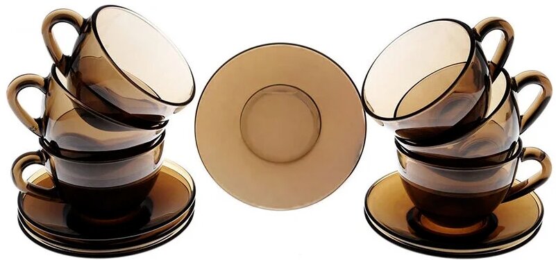 Il servizio da tè è pensato per 6 persone, è composto da 12 pezzi: 6 tazzine, piattini. Materiale: vetro resistente agli urti. Colore: traslucido, marrone fumo.