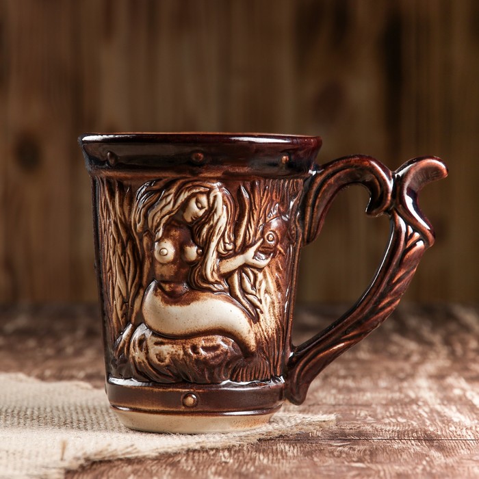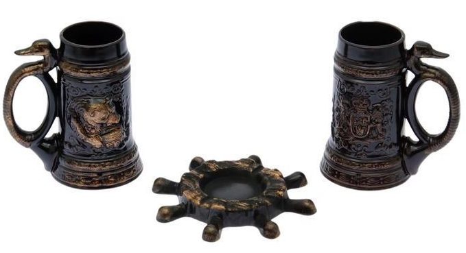 I piatti in ceramica hanno un aspetto attraente e saranno un regalo ideale per ogni uomo. La capacità della nave è di 500 ml. Il comodo manico si adatta bene alla mano indipendentemente dalle dimensioni del palmo. In una tale nave, la birra rimane fredda per un lungo periodo e non perde le sue caratteristiche gustative. Il set comprende 2 tazze confezionate in una comoda confezione, così dopo l'uso i piatti sono facili da riporre.