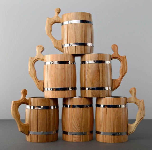 Sin dai tempi antichi, i contenitori di legno sottolineano il gusto della bevanda, quindi l'albero sta guadagnando grande popolarità. Il set è realizzato in rovere, quindi è resistente. Lo speciale aroma di legno conferisce alla birra astringenza e un insolito retrogusto. I contenitori possono contenere 500 ml, sono incluse 6 tazze in totale, quindi viene spesso utilizzato per una grande azienda. Speciali bordi in metallo consentono alle stoviglie di mantenere la loro forma per un lungo periodo. Il manico sta comodamente nel palmo della tua mano e non scivola.