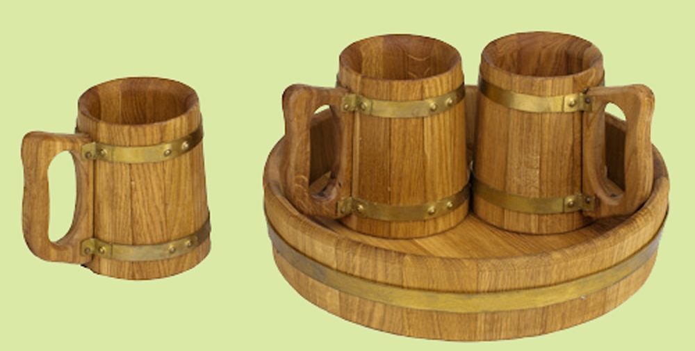 Il modello è adatto per una piccola azienda. I piatti sono realizzati in rovere di alta qualità, quindi dureranno a lungo senza perdere il loro aspetto. Il materiale non viene lavorato, quindi non intacca il gusto della bevanda, anche con un uso frequente. La capacità dei vasi è di 500 ml. Comodi manici sovradimensionati assicurano una presa salda anche con le mani bagnate. Pertanto, il modello è l'ideale per andare al bagno.