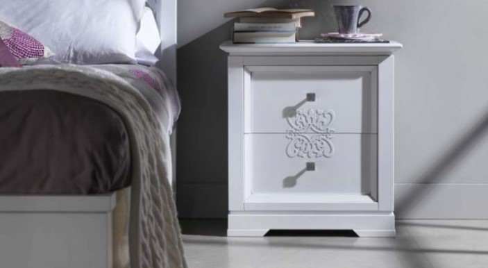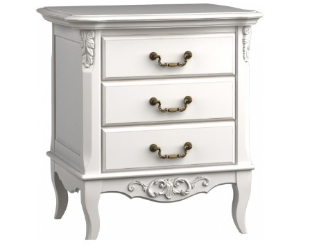 Un elegante comodino bianco con gambe aggraziate, elementi decorativi intagliati della facciata e maniglie dei cassetti in ferro battuto sarà una vera decorazione di una camera da letto classica, gotica o barocca. Sulla parte superiore della superficie della custodia, una lampada o una foto cara al cuore in una cornice corrispondente allo stile generale starà benissimo. Tre piccoli ma capienti cassetti nasconderanno tutte le piccole cose necessarie.