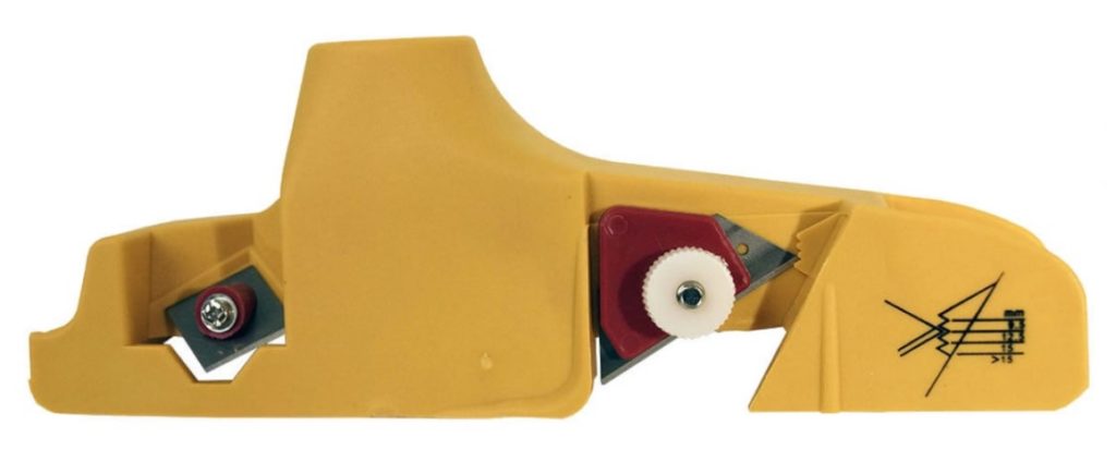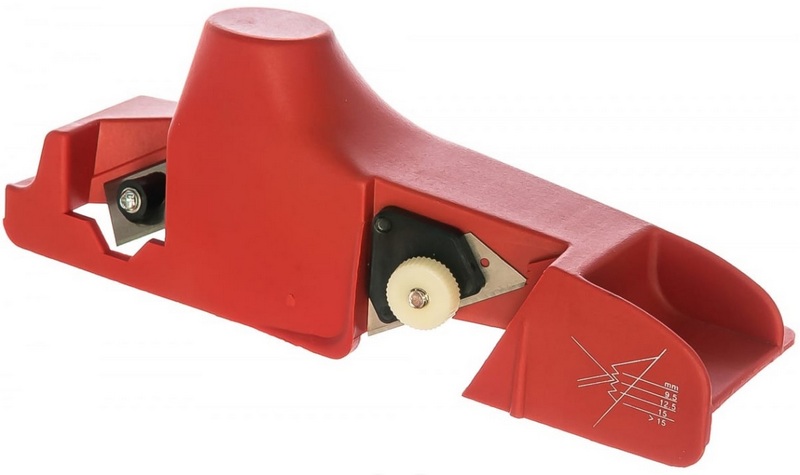 Il modello più semplice di una pialla per bordi per la lavorazione del muro a secco. In generale, è caratterizzato come un dispositivo conveniente che non viene caricato con funzioni non necessarie. In grado di elaborare il bordo del pannello GKL ad angoli da 22,5 a 45 gradi. Il campione può essere adattato allo spessore del materiale lavorato: 9,5, 12,5 e 15 millimetri. Il dispositivo è realizzato con acciai per utensili durevoli. Il paese di origine è la Russia, il costo consigliato per le catene di negozi è di 310 rubli.