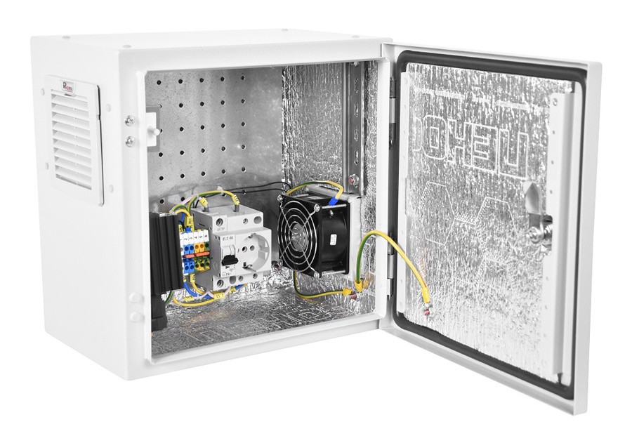 All'interno è presente un materiale termoisolante che riflette le radiazioni dei componenti elettronici ed elettrici. Il calore fuoriesce attraverso la parete posteriore perforata. In inverno, il gelo non può penetrare all'interno e interferire con il funzionamento delle apparecchiature installate.