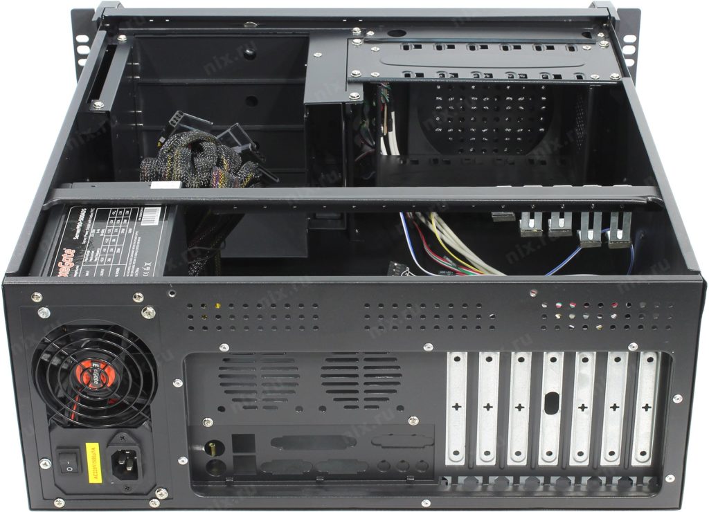 In effetti, il case del server è un insieme completo di apparecchiature per la memorizzazione delle informazioni. Alloggiamento separato per schede madri 4U, alloggiamenti per unità, ventole di raffreddamento. Ci sono interruttori sul pannello frontale.