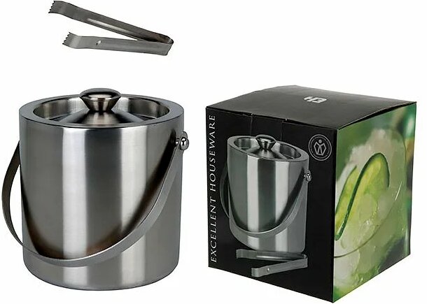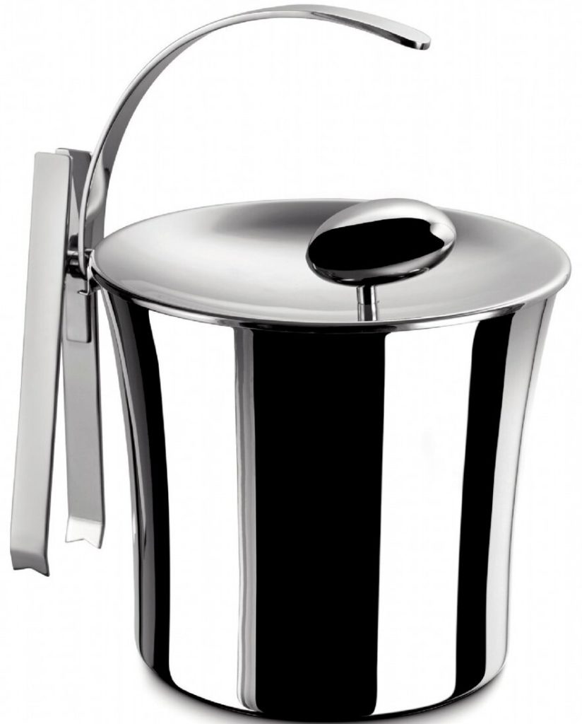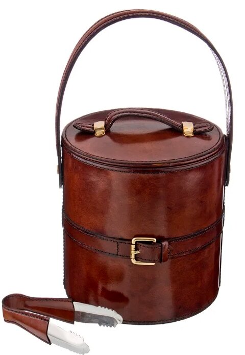 Il set è composto da un secchio, un coperchio, una pinza. Il secchio è realizzato in acciaio inossidabile. acciaio (parte interna), racchiuso in una custodia in pelle. C'è un coperchio in metallo con uno strato superiore in pelle. Due tipi di maniglie: cinghie sul tetto, lati della custodia. Una decorazione separata è una cintura in pelle, una fibbia nella parte centrale.