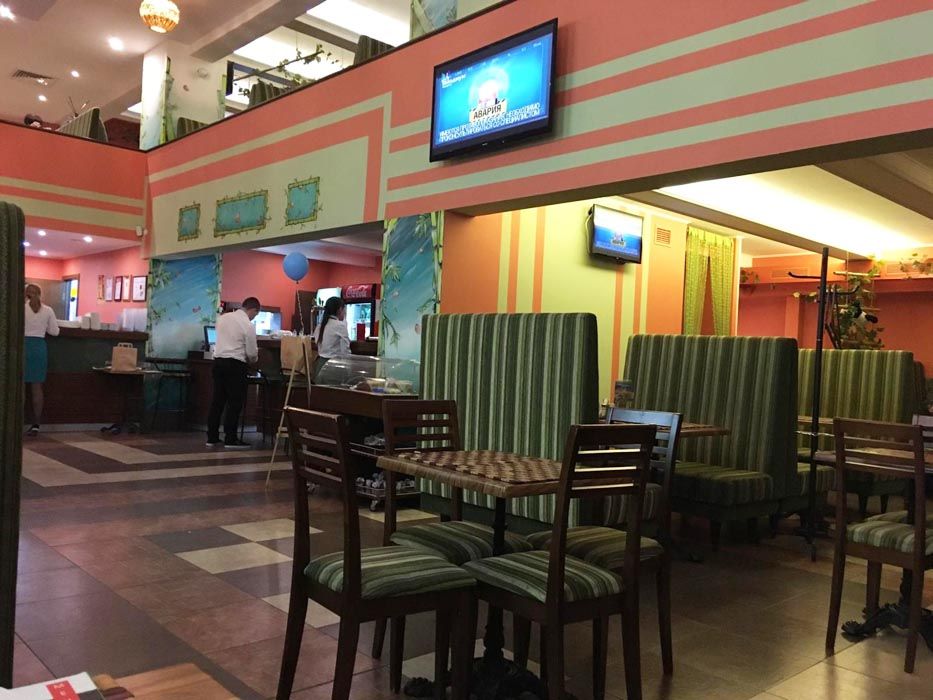 Il sushi cafe con il nome divertente "Bambushi" offre un vasto assortimento di vari piatti della cucina mondiale, dai classici agli esotici.Questa è una vasta gamma di piatti giapponesi, piatti gourmet dal menu europeo e per i giovani visitatori, la caffetteria offre un menu per bambini.