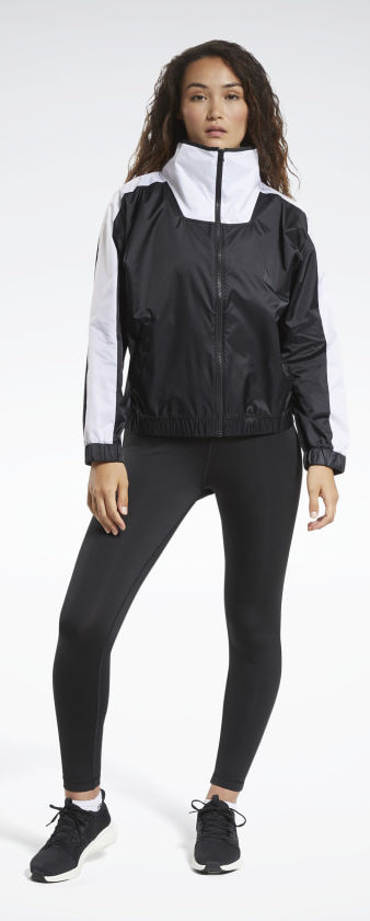 La tuta è perfetta per l'allenamento all'aperto in tarda primavera e all'inizio dell'autunno. Il set è composto da giacca e leggings. Ci sono due opzioni di colore: bianco e nero e viola e nero. Allo stesso tempo, in entrambe le versioni, i leggings sono realizzati in un monocolore - nero. La giacca ha una cerniera completamente slacciata, sulle maniche e sul fondo è presente un elastico. Stile: libero, abbreviato. Il collo è protetto dal vento da un collo alto in contrasto colore. Il logo del brand è sul retro.
