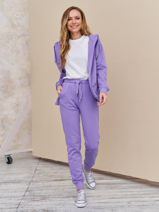 La felpa con cappuccio ha un cappuccio, non c'è cerniera, quindi indossarla è sopra la testa. I pantaloni sono fissati in vita con una cintura elastica, lungo la parte inferiore delle gambe - polsini, tasche sono previste per una maggiore comodità.