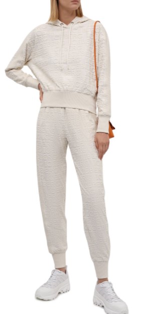 Il materiale dei pantaloni da jogging è completamente simile alla felpa con cappuccio. E anche se il logo strutturato adorna l'intera superficie del prodotto, non sembra accattivante o pretenzioso. A una rapida occhiata, potrebbe non essere nemmeno evidente, ma dopo un esame risalterà per la consistenza della spugna. C'è un cordoncino in vita per una migliore vestibilità. Il fondo delle gambe è incorniciato da polsini elastici alti.