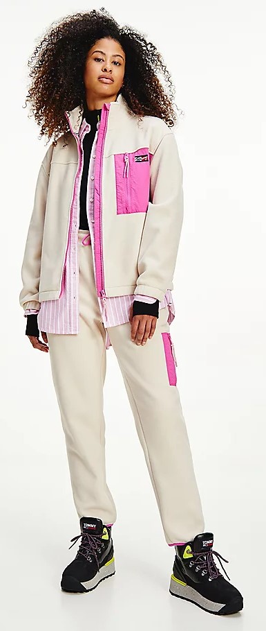 La felpa corta ha un cappuccio e una zip completamente decompressa. Le maniche e l'orlo sono rifiniti con polsini larghi elastici. Pantaloni dal taglio libero con polsini al fondo. La vestibilità è alta e c'è una coulisse in vita.