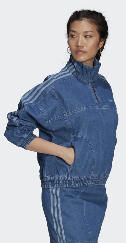 Quindi, una giacca olimpica: questo è un modello dalla vestibilità standard realizzato in 100% cotone, che ha una cerniera che si apre al centro del petto e un colletto rialzato. Ci sono tasche laterali. Le maniche presentano le iconiche 3 strisce.