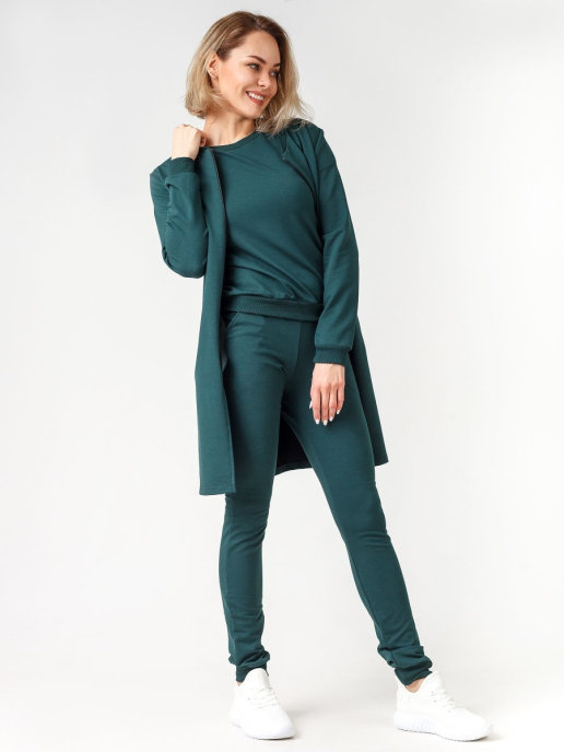 Questo modello non è posizionato esclusivamente per le donne con forme lussuose ed è ammesso in una gamma di taglie dalla XS alla 4XL. Questo modello è adatto per "pyshechek" ed è dotato di un cardigan a taglio libero. Il taglio dritto e la lunghezza al ginocchio allungano visivamente la silhouette e snelliscono il suo proprietario. Oltre al cardigan, il kit comprende una t-shirt con maniche corte: scollo - sotto la gola, elastico in basso; pantaloni - su un elastico, con polsini elastici dal basso. Il materiale è gradevole al corpo, morbido, il tessuto è una combinazione di cotone (70%) con poliestere e lycra.