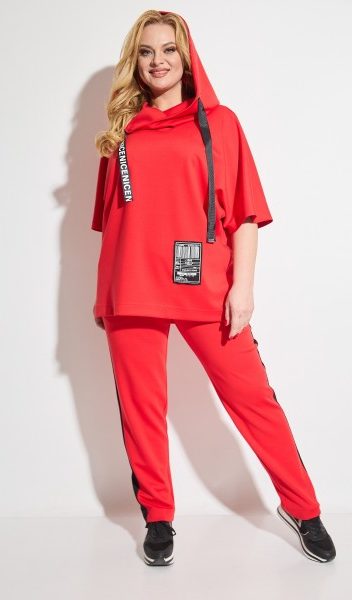 L'abito bielorusso, cucito con maglieria di alta qualità, è composto da pantaloni e un maglione. Pantaloni: dritti, a vita alta, decorati con strisce a contrasto, tasche laterali per comodità. Maglia ampia con maniche corte in un pezzo e collo con cappuccio. Dotato di rifiniture decorative a contrasto. Non isolato, progettato per essere indossato in primavera e in estate.
