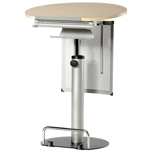 La comoda versione rotonda è progettata per il lavoro in piedi. Il sistema permette di modificare non solo l'altezza, ma anche l'inclinazione del piano del tavolo fino a 15 gradi. Dispone di comode ruote che consentono di spostare il tavolo in qualsiasi luogo comodo per lavorare. Costo: 57790 rubli.