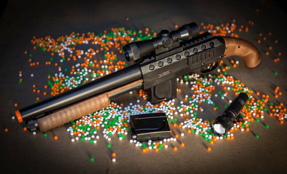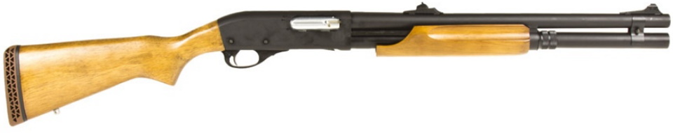 Modello classico del prototipo del popolare Remington 870 per l'uso nei giochi di ruolo di squadra. Per la fabbricazione del corpo viene utilizzata una lega di alluminio, le maniglie e le aste sono in legno. L'assemblaggio di alta qualità garantisce la completa assenza di gioco. La mira viene effettuata tramite mirino e tacca di mira regolabili. Le girelle sono installate sul ponticello tra il tubo del caricatore e la canna e sul calcio per la cintura. Il tiro viene effettuato immediatamente con 11 palline. Dopo ogni colpo, viene eseguito un armamento manuale, simile all'originale da combattimento. Viene utilizzato gas CO2, il serbatoio è nel cancello.