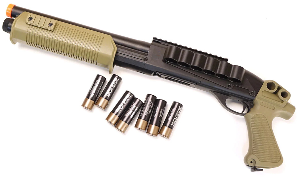 Una replica compatta a tre canali del fucile a canna liscia Franchi SPAS-12 italiano per l'uso nel combattimento ravvicinato softair. Ogni nuovo colpo richiede l'armamento manuale della molla con un movimento caratteristico dell'avambraccio mobile, come un vero fucile a pompa. Le munizioni di 30 palline di plastica sono poste in cartucce di proiettili, che, una volta sparate, volano fuori in tre pezzi per aumentare l'area di distruzione. La prevedibilità della traiettoria di volo si ottiene utilizzando un sistema Hop Up fisso. Per alleggerire il peso e la possibilità di sparare con una mano, il design utilizza plastica resistente.