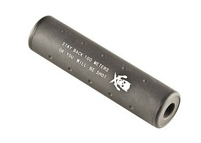 Il dispositivo è adatto a quasi tutte le pistole softair, ha una filettatura standard. Il caso è scorrevole, comprensibile. Dentro c'è una molla, c'è della gommapiuma.Le informazioni di base sul prodotto vengono applicate con vernice bianca, un'immagine a forma di teschio e ossa incrociate.