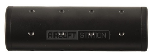 Ugello cavo in lega di alluminio nero. La custodia liscia ha piccoli ritagli decorativi rotondi in tutta l'area, in sintonia con il logo dell'azienda. L'apparecchio ha una filettatura standard a doppia faccia che ne consente l'abbinamento con molti tipi di pistole softair.