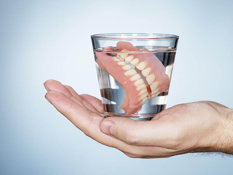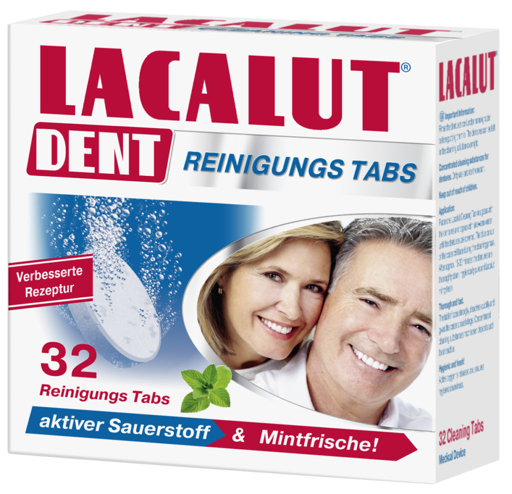 Solitamente pulita con spazzolino e filo interdentale, la protesi viene posta in una soluzione (1 compressa ogni 150 ml di acqua) per 20 minuti. A seconda della marca, la quantità di acqua, la preparazione e il tempo per la detersione possono variare, quindi leggere attentamente le istruzioni.