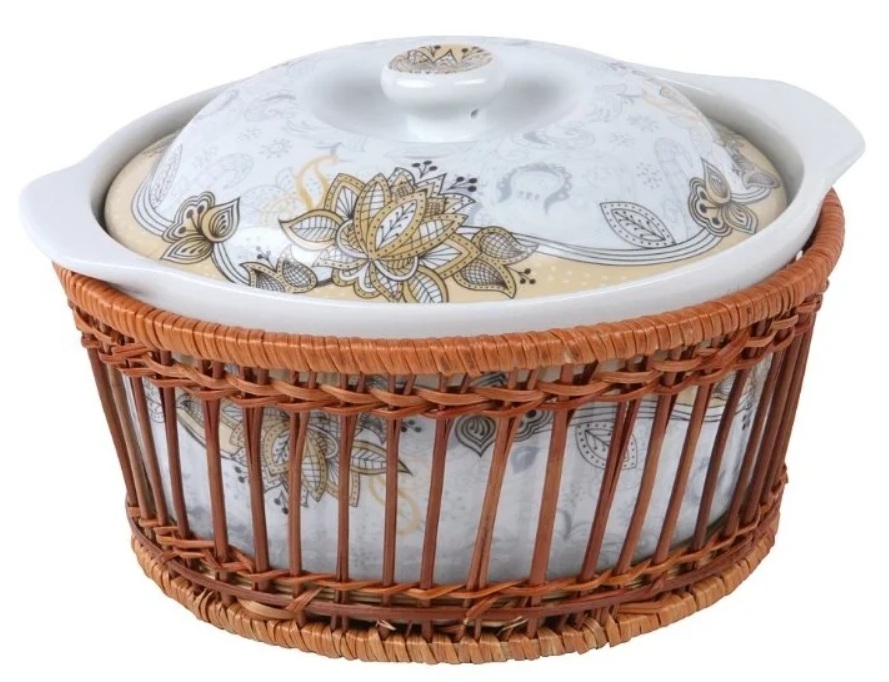 Una bella ciotola dipinta con un coperchio incassato ha un aspetto festoso ed è completata da un cesto da portata in vimini.