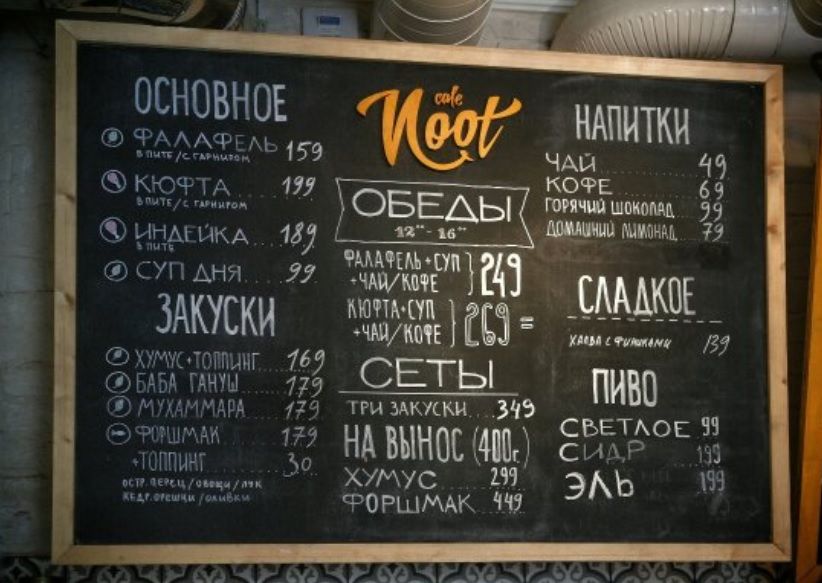 Noot è un posto dove puoi provare i falafel con couscous, zuppa di zucca, hummus, muffin, piadine, torta di patate, hamburger di pesce, panini al sesamo fatti in casa e pastella di tortino di birra condita con una speciale salsa all'arancia.