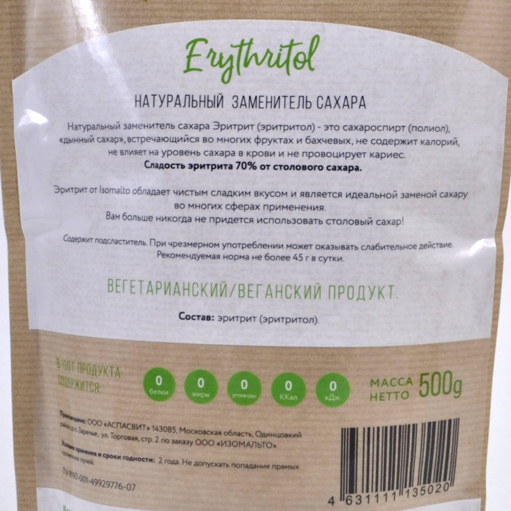 Questo dolcificante naturale è prodotto in Russia. Si distingue per il suo contenuto calorico zero, la mancanza di odore e gli effetti sotto forma di cambiamento dei livelli di glucosio nel sangue. L'eritritolo è attivamente utilizzato in cucina, nonostante abbia un gusto inferiore allo zucchero normale.